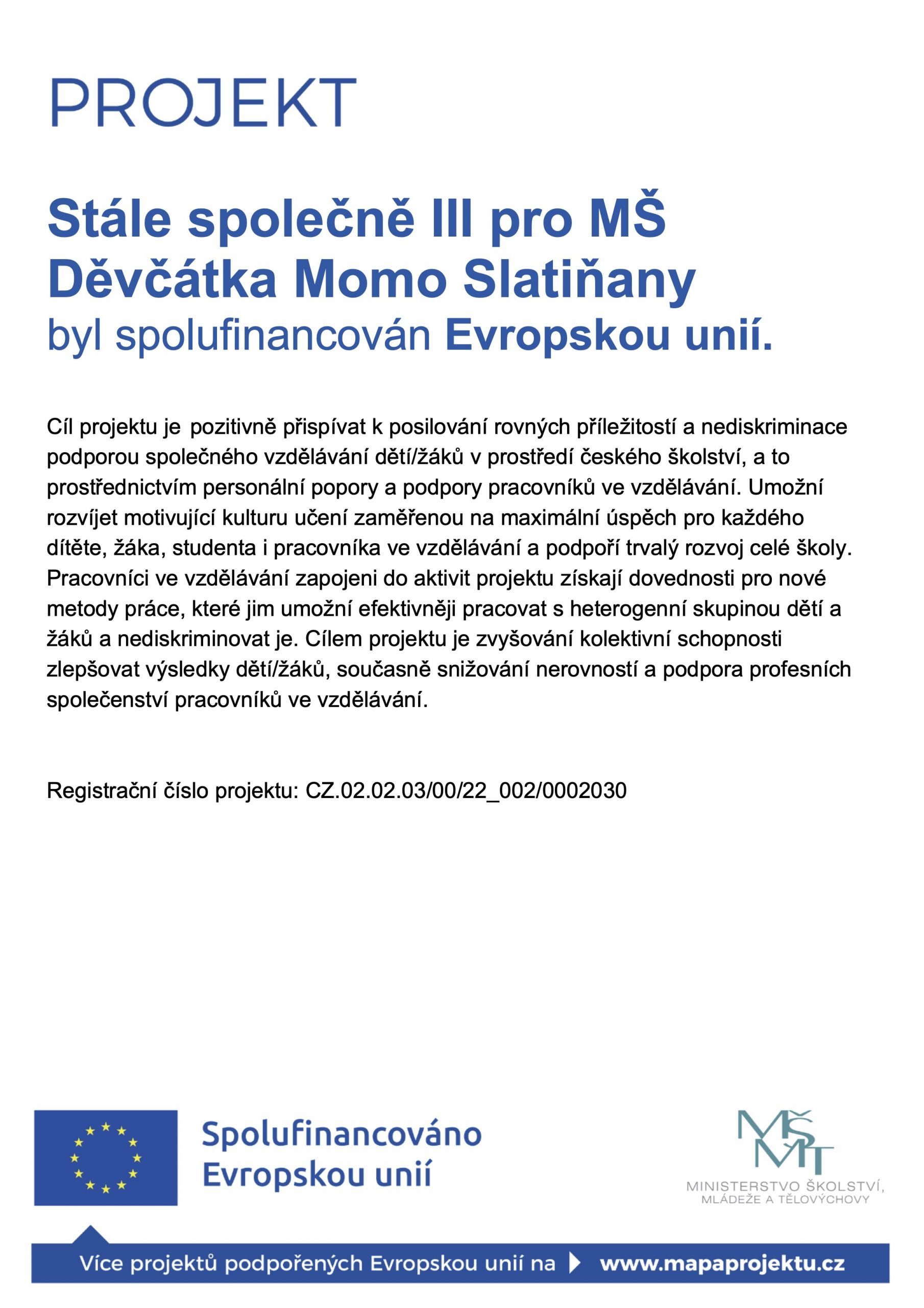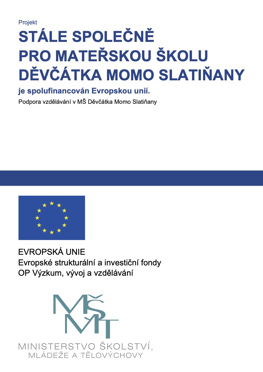 Informace o poskytnutí dotace k projektu "Společně k úspěchu pro MŠ Děvčátka MOMO Slatiňany". Projekt je spolufinancován Evropskou unií. Projekt CZ.02.3.68/0.0/0.0/18_063/0010554 ve Výzvě č. 02_18_063 Šablony II - MRR ,
